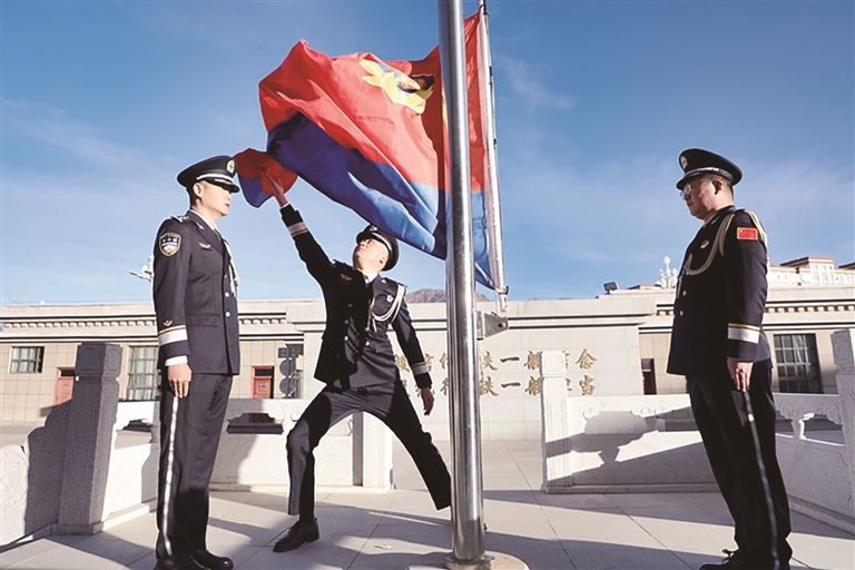 ལྷ་ས་གྲོང་ཁྱེར་སྤྱི་བདེ་ཅུས་དང་། འགྲིམ་འགྲུལ་དོ་དམ་ཉིང་ལག་རུ་ཁག ལེགས་རྩེ་རྒྱལ་མཚམས་འཛུལ་སྒྲོལ་མཐའ་མཚམས་ཞིབ་བཤེར་ས་ཚིགས། བོད་ལྗོངས་མཐའ་མཚམས་ཞིབ་བཤེར་སྤྱི་ཁྱབ་ས་ཚིགས་ཁྲིམས་སྒྱུར་བརྟག་དཔྱད་ཉིང་ལག་རུ་ཁག་སོགས་སྡེ་ཚན་གྱིས་སྔ་རྗེས་སུ་ཉེན་རྟོག་དར་ཆ་སྒྲེང་བའི་མཛད་སྒོ་འཚོགས་ཤིང་། ཉེན་རྟོག་དར་ཆ་སྲུང་སྐྱེལ་པས་གོམ་སྟབས་བརྟན་པོ་སྤོས་ནས་ཉེན་རྟོག་དར་ཆ་སྲུང་སྐྱེལ་བྱས་པ་དང་། མི་དམངས་ཉེན་རྟོག་པ་དང་ལས་རོགས་ཉེན་རྟོག་པ་ཡོངས་ཀྱིས་སྤྱི་བདེའི་ལས་གོས་གྱོན་ནས་སྒམ་བརླིང་ངང་གྲལ་བསྟར་འགྲིག་པོས་ལངས་ཏེ་དལ་བུར་སྒྲེང་བའི་ཉེན་རྟོག་དར་ཆར་གུས་འདུད་ཞུས་ཤིང་། རྔམ་བརྗིད་ལྡན་པའི་ཉེན་རྟོག་གླུ་དབྱངས་ཁྲོད་ལས་རིགས་དེར་བཅངས་པའི་དད་གུས་དང་འགན་འཁྲི་བརྟན་སྲུང་བྱེད་ལུགས་མཚོན་པར་བྱས་པ་རེད།