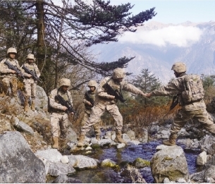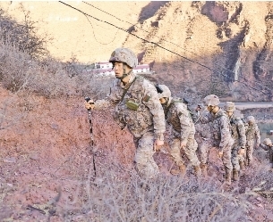 ཉེ་ཆར། དཔོན་དམག་གི་མཐོ་གྲང་རི་ཁུལ་དུ་འཐབ་འཛིང་བྱེད་ནུས་དང་ཞུམ་མེད་ཀྱི་སྙིང་སྟོབས་ལ་ཞུན་བརྡར་བྱ་ཆེད། བོད་དམག་ཁུལ་ཁང་གི་དཔུང་སྡེ་ཞིག་གིས་ས་མཐོར་རི་འཛེག་སྦྱོང་བརྡར་བྱས་པ་རེད། འདི་ནི་སྦྱོང་བརྡར་བྱ་ཡུལ་དུ་དཔོན་དམག་གིས་རི་མཐོ་གཡང་གཟར་ལ་འཛེག་བཞིན་པ།