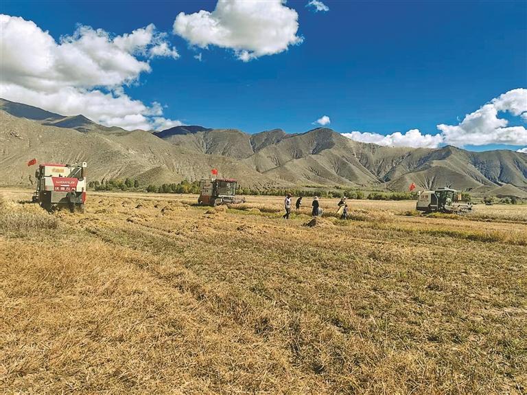 “ད་ཆ་ང་དང་བཟའ་ཟླ་གཉིས་ཁོ་ནས་ས་ཞིང་མུའུ་31ལ་གཡོག་བྱེད་ཐུབ་པ་དང་། ཞིང་དལ་དུས་སུ་ད་དུང་གྲོང་ཁྱེར་དུ་ལས་ཀར་འགྲོ་ཐུབ་ཀྱི་འདུག”ཅེས་ཡུལ་མི་ཚེ་བརྟན་དོན་གྲུབ་ཀྱིས་ཐོ་ཕྲུག་ནས་འབབ་ཞོར་དུ་ལུས་སྟེང་གི་ཐལ་རྡུལ་རྣམས་རྡེབ་ཙམ་བྱས། ཚེ་བརྟན་དོན་གྲུབ་ཁྱིམ་ལ་མི་ལྔ་ཡོད་པ་དང་། སྔོན་ཆད་སྟོན་ཀ་སླེབས་རིམ་བཞིན་གཙོ་བོ་མི་ཤུགས་ལ་བརྟེན་ནས་བརྔ་བསྡུ་བྱེད་དགོས་ཀྱི་ཡོད་པས། ཉིན་བཅུ་ཙམ་འགོར་གྱི་ཡོད། ད་ལོ་མཉམ་ལས་ཁང་གི་མཉམ་འབྲེལ་བརྔ་བསྡུ་འཕྲུལ་འཁོར་གྱིས་བརྔ་བསྡུ་བྱས་པས་ན་ཉིན་གཅིག་ནང་ཚར་གྱི་ཡོད། ས་ཞིང་མུའུ་རེར་སྒོར་80ཙམ་ལས་དགོས་ཀྱི་མེད། “ཞིང་དལ་དུས་སུ་ངས་གཞིས་རྩེ་གྲོང་ཁུལ་དུ་གླ་པ་རྒྱུག་ན་ལོ་གཅིག་ལ་སྒོར་ཁྲི་བཞི་ལྔ་རག་གི་འདུག”ཅེས་བཤད།