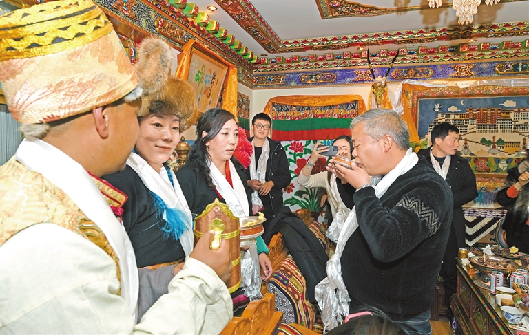 ད་ཕན་ལོ་ཤས་རིང་བོད་རང་སྐྱོང་ལྗོངས་ཀྱིས་གྲོང་གསེབ་ཀྱི་ཡུལ་སྐོར་ཐོན་ལས་འཕེལ་རྒྱས་ཤུགས་ཆེན་བཏང་ནས། གྲོང་གསེབ་ཀྱི་ཡུལ་སྐོར་འཛུགས་སྐྲུན་ལ་སྐུལ་འདེད་གཏོང་བ་དང་ཁྱད་ལྡན་མི་རིགས་ལག་ཤེས་བཟོ་རྩལ་དང་། སོལ་དལ་ཡུལ་སྐོར། ཁྱད་ལྡན་འདེབས་འཛུགས་སོགས་ཐོན་ལས་ལ་ཕྱོགས་ཡོངས་ནས་སྐུལ་འདེད་བཏང་བས། མང་ཚོགས་རྣམས་འབབ་འཕར་ཕྱུག་འགྱུར་ཡོང་བར་སྣེ་ཁྲིད་ཐུབ་ཅིང། འདི་ནི་ལྷ་ས་གྲོང་ཁྱེར་ཁྲེང་ཀོན་ཆུས་དོག་སྡེ་ཁྲོམ་གཞུང་གི་བོད་ཟས་ཁང་དུ་ཡུལ་སྐོར་བས་ནས་ཆང་གི་བྲོ་བ་མྱོང་བཞིན་པ།