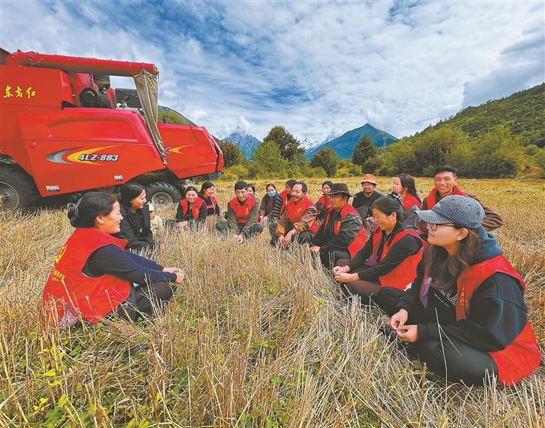 ལོ་ཏོག་བསྡུ་བའི་སྟོན་གྱི་དུས་སུ། ཉིང་ཁྲི་གྲོང་ཁྱེར་ཀོང་པོ་རྒྱ་མདའ་རྫོང་མཚོ་མགོ་ཤང་བྱེ་པ་གྲོང་ཚོའི་གྲོང་སྡོད་ལས་དོན་རུ་ཁག་གི་རུ་མི་དང་གྲོང་ཚོའི“ཨུ་ལྷན་གཉིས”ཀྱི་ཚན་ཁག་གི་ཁོངས་མིས་ཞིང་ནང་དང་མུ་ཁར་དམངས་ཕན་སྲིད་ཇུས་སྒྲོག་འགྲེལ་བྱས་ཤིང་། འདི་ནི་ལས་དོན་པས་མང་ཚོགས་ལ་དམངས་ཕན་སྲིད་ཇུས་སྒྲོག་འགྲེལ་བྱེད་བཞིན་པ།