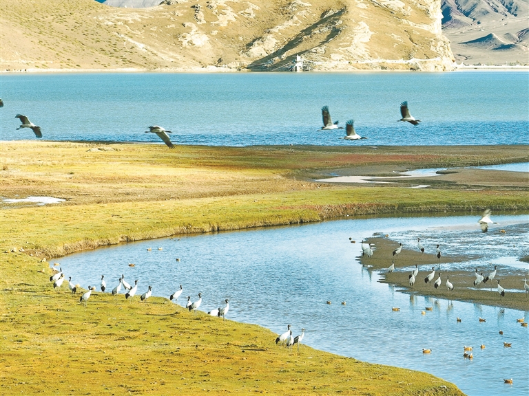 སྟོན་དུས་ཀྱི་ལྷུན་གྲུབ་ནི། དགུན་ཁའི་དཔལ་ལ་རོལ་བའི་བསུ་མ་ལྟ་བུའང་རེད། ཡར་ཀླུང་གཙང་པོའི་ཁྲུང་ཁྲུང་སྐེ་ནག་རྒྱལ་ཁབ་རང་བྱུང་སྲུང་སྐྱོང་ཁུལ་དུ་བསྐྱོད་ན། རྒྱང་རིང་དུ་གཉན་ཆེན་ཐང་ལྷའི་རི་མགོ་ཁ་བས་ཡོངས་སུ་བཀླུབས་ཤིང་། ཉེ་སའི་མཚེའུའི་ངོས་སུ་ལྗོན་ཤིང་དག་གི་མཛེས་ཉམས་རྣམ་པར་གསལ། འདམ་རྩྭའི་གསེབ་ནས་འཇོ་སྒེག་གི་གར་སྟབས་མངོན་པ་ནི་སྔ་ས་ནས་སླེབས་ཟིན་པའི་ཁྲུང་ཁྲུང་སྐེ་ནག་གི་ཁྱུ་ཚོགས་རེད། ནགས་སྲུང་བ་དོན་གྲུབ་ཚེ་རིང་གིས་སྐད་གདངས་དམའ་པོས“ད་ལོ་འདབ་ཆགས་རྣམས་ལོ་སྔོན་མ་དང་བསྡུར་ན་ཉིན་ཁ་ཤས་ཀྱིས་སྔ་བ་སླེབས་འདུག ད་ལྟ་ཁྲུང་ཁྲུང་30ལྷག་ཙམ་ལས་མེད་ནའང་ཟླ་11པའི་ཟླ་དཀྱིལ་དང་ཟླ་སྨད་ནས་སང་ལོའི་ཟླ་3པའི་བར་ཁྲུང་ཁྲུང་སྐེ་ནག་2000ལྷག་སྔ་རྗེས་སུ་འཕུར་ཡོང་གི་ཡོད། མཁར་རྩེ་ཤང་གི་ནས་ཞིང་དང་ལྕང་ར་ཤར་ཤང་གི་འདམ་རར་ཁྲུང་ཁྲུང་དག་བག་ཕེབས་ངང་རྒྱུ་བའི་རྣམ་པ་མཐོང་རྒྱུ་ཡོད། དེ་ནི་ལྷུན་གྲུབ་ཀྱི་དགུན་ཁའི་རྣམ་པ་མཛེས་ཤོས་རེད”ཅེས་བརྗོད།
