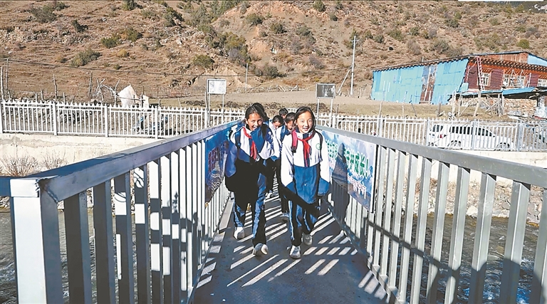 འདི་ནི་རྩེ་པ་ཤང་སློབ་ཆུང་གཉིས་པའི་སློབ་ཕྲུག་ཚོ་དགའ་སྤྲོའི་ངང་གྲོང་སྡོད་ལས་དོན་རུ་ཁག་གིས་གསར་དུ་བསྐྲུན་པའི་ཟམ་པའི་ཐོག་སྐྱོད་བཞིན་པ།