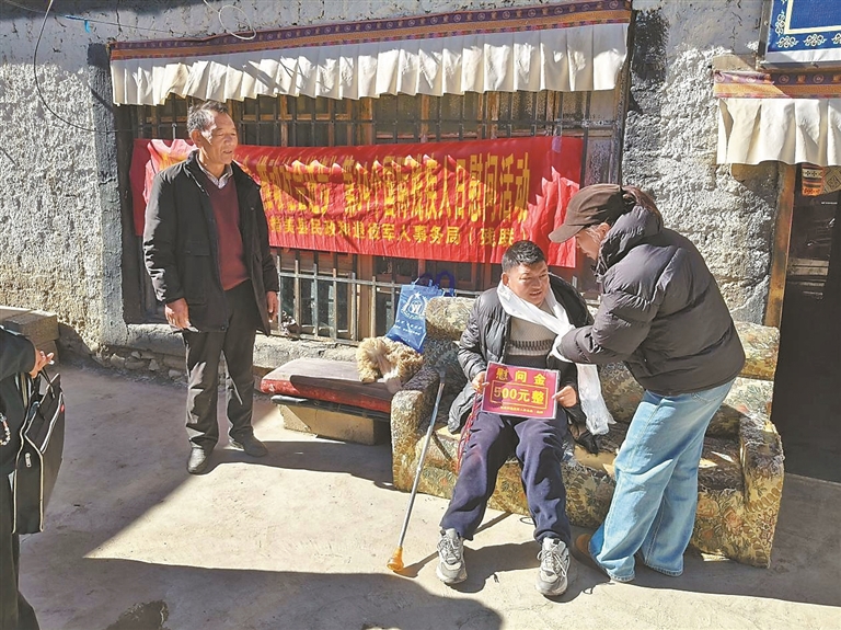 ཉིན་ཤས་གོང་། མཚོ་སྨད་རྫོང་དབང་སྐྱོན་མཉམ་འབྲེལ་ལྷན་ཚོགས་ཀྱིས་དཀའ་ངལ་ཡོད་པའི་དབང་པོ་སྐྱོན་ཅན་ལ་འཚམས་འདྲི་བྱེད་པའི་བྱེད་སྒོ་སྤེལ་ནས། རྫོང་ཡོངས་ཀྱི་འཚོ་བར་དཀའ་ངལ་ཡོད་པའི་དབང་པོ་སྐྱོན་ཅན་12ལ་འཚམས་འདྲིའི་དངུལ་དང་དྲོད་སྲུང་གྱོན་ཆས་སོགས་སྤྲད་དེ། བྱ་སྤྱོད་དངོས་ཀྱི་ཐོག་ནས་དམིགས་བསལ་ཚོགས་སྤྱིར་གཅེས་སྐྱོང་དང་རྒྱབ་སྐྱོར་བྱས་པ་རེད།