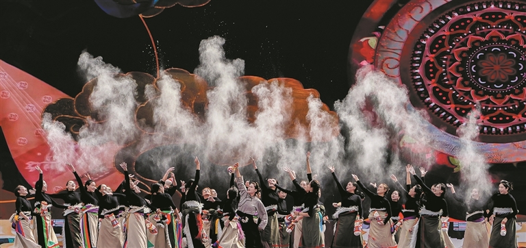 འདི་ནི་9ཚེས་15ཉིན་གྱི་འགོ་ཚུགས་མཛད་སྒོར་བུད་མེད་ཀྱི་རྐྱང་གཞས《བོད་ཤར་མུ་ཏིག》ཅེས་པ་ལེན་བཞིན་པ།