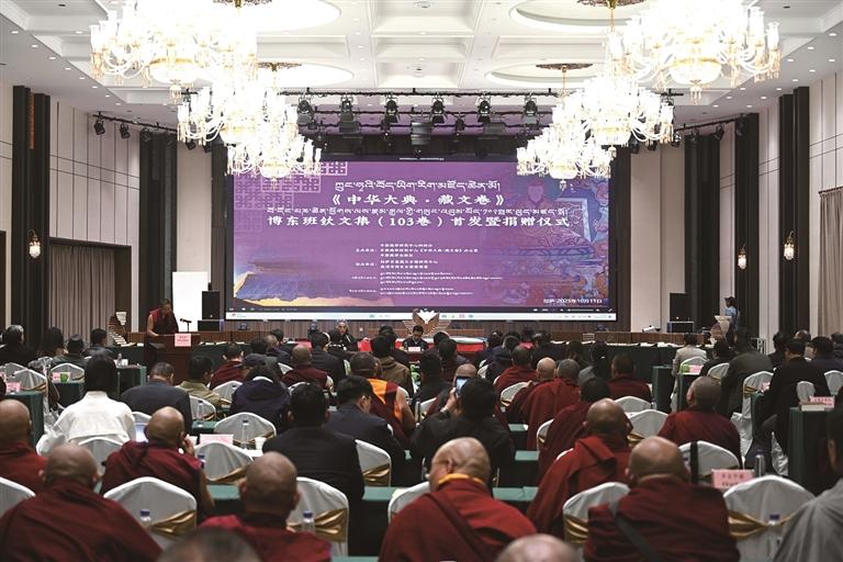 འབྲས་བཟང་སྨིན་པའི་སྟོན་གྱི་དུས་བཟང་འདིར། ཤེས་རིག་གཏམ་བཟང་གངས་ལྗོངས་ཡུལ་ནས་གྲགས། སྤྱི་ཁྱབ་ཧྲུའུ་ཅི་ཞི་ཅིན་ཕིང་གི་རིག་གནས་དགོངས་པ་ལག་བསྟར་དོན་འཁྱོལ་གཏིང་ཟབ་དང་། ཀྲུང་ཧྭའི་ཕུལ་བྱུང་སྲོལ་རྒྱུན་རིག་གནས་དར་སྤེལ། བོད་བརྒྱུད་ནང་བསྟན་ཀྲུང་གོ་ཅན་ལ་སྐུལ་འདེད་ཧུར་ཐག་གཏོང་ཆེད། བོད་རང་སྐྱོང་ལྗོངས་དབུ་བརྙེས་ནས་ལོ་ངོ་60འཁོར་བར་རྟེན་འབྲེལ་ཞུ་བའི་སྐལ་བཟང་གི་དུས་འདིར། ཀྲུང་གོ་བོད་རིག་པ་ཞིབ་འཇུག་ལྟེ་གནས་ཚན་ཞིབ་ཁང་དང་། 《ཀྲུང་ཧྭའི་བོད་ཡིག་རིག་མཛོད་ཆེན་མོ》གཞུང་ལས་ཁང་། ཀྲུང་གོ་བོད་རིག་པ་དཔེ་སྐྲུན་ཁང་བཅས་ཀྱིས་གཙོ་གཉེར་བྱས་པ་དང་། ལྷ་ས་དཔལ་བརྩེགས་བོད་ཡིག་དཔེ་རྙིང་ཞིབ་འཇུག་ལྟེ་གནས་དང་ལྷོ་ཁ་གྲོང་ཁྱེར་སྣ་དཀར་རྩེ་རྫོང་བསམ་སྡིངས་དགོན་བོ་དོང་དཔེ་རྙིང་ལེགས་སྒྲིག་གཞུང་ལས་ཁང་གིས་གཞོགས་འདེགས་ཐོག་གཉེར་བའི《ཀྲུང་ཧྭའི་བོད་ཡིག་རིག་མཛོད་ཆེན་མོ》བོ་དོང་པཎ་ཆེན་ཕྱོགས་ལས་རྣམ་རྒྱལ་གྱི་གསུང་འབུམ་པོད་103གྱི་པར་ཕུད་འགྲེམས་སྤེལ་དང་དཔེ་སྦྱིན་མཛད་སྒོ་ཉིན་ཤས་གོང་ལྷ་སར་གཟབ་རྒྱས་ངང་འཚོགས་པ་རེད།