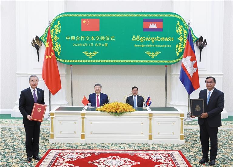 ཟླ་4ཚེས་17ཉིན་གྱི་དགོང་མོར། རྒྱལ་ཁབ་ཀྱི་ཀྲུའུ་ཞི་ཞི་ཅིན་ཕིང་གིས་ཕ་ནོམ་ཕེན་གྱི་ཞི་བདེ་ཐོག་བརྩེགས་ཁང་ཆེན་དུ་ཁམ་ཕུ་ཁྲེའི་དབུ་བཞུགས་བློན་ཆེན་ཧུང་མ་ནའེ་དང་གྲོས་མོལ་གནང་བ་རེད། འདི་ནི་གྲོས་མོལ་གནང་མཇུག་འགྲིལ་རྗེས། རྒྱལ་ཁབ་གཉིས་པོའི་འགོ་ཁྲིད་ཀྱིས་ཀྲུང་གོ་དང་ཁམ་ཕུ་ཁྲེ་ཕྱོགས་གཉིས་པོས་ཕྱོགས་གཉིས་པོའི་མཉམ་ལས་ཡིག་ཆ་བརྗེ་རེས་བྱས་པར་དཔང་པོ་གནང་བ།