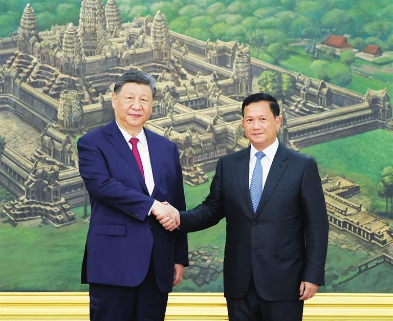ཤིན་ཧྭ་གསར་འགྱུར་ཁང་གྲོང་ཁྱེར་ཕ་ནོམ་ཕེན་ནས་ཟླ་4ཚེས་17ཉིན་གློག་འཕྲིན་འབྱོར་གསལ། ཟླ་4ཚེས་17ཉིན་གྱི་དགོང་མོར། རྒྱལ་ཁབ་ཀྱི་ཀྲུའུ་ཞི་ཞི་ཅིན་ཕིང་གིས་ཕ་ནོམ་ཕེན་གྱི་ཞི་བདེ་ཐོག་བརྩེགས་ཁང་ཆེན་དུ་ཁམ་ཕུ་ཁྲེའི་དབུ་བཞུགས་བློན་ཆེན་ཧུང་མ་ནའེ་དང་གྲོས་མོལ་གནང་བ་རེད། རྒྱལ་ཁབ་གཉིས་ཀྱི་འགོ་ཁྲིད་ཀྱིས་ལག་གདང་སྦྲེལ་ནས་དུས་རབས་གསར་པའི་དུས་དང་རྣམ་པ་ཀུན་གྱི་ཀྲུང་གོ་དང་ཁམ་ཕུ་ཁྲེའི་ལས་དབང་གཅིག་མཐུན་ཚོགས་པ་འཛུགས་རྒྱུའི་མོས་མཐུན་མགྲིན་གཅིག་ཏུ་གནང་བ་དང་2025ལོ་ནི“ཀྲུང་གོ་དང་ཁམ་ཕུ་ཁྲེའི་ཡུལ་སྐོར་ལོ”ཡིན་པའི་ཁྱབ་བསྒྲགས་གནང་བ་རེད།