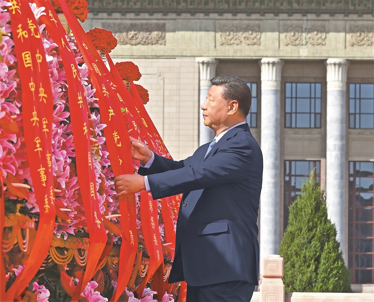 ཟླ་9ཚེས་30ཉིན་གྱི་སྔ་དྲོར། ཏང་དང་རྒྱལ་ཁབ་ཀྱི་འགོ་ཁྲིད་པ་ཞི་ཅིན་ཕིང་དང་། ལི་ཆང་། ཀྲའོ་ལེ་ཅི། ཝང་ཧུའུ་ཉིང་། ཚའེ་ཆི། ཏིང་ཤུའེ་ཞང་། ལི་ཞི། ཧན་ཀྲེང་སོགས་པེ་ཅིང་གནམ་བདེ་སྒོ་མོ་ཆེའི་ཐང་ཆེན་དུ་ཕེབས་ནས། སྔོན་གཤེགས་དཔའ་བོའི་དྲན་གསོའི་ཉིན་མོར་མི་དམངས་ཀྱི་དཔའ་བོར་མེ་ཏོག་སི་ར་འབུལ་བའི་མཛད་སྒོར་ཞུགས་བཞིན་པ།