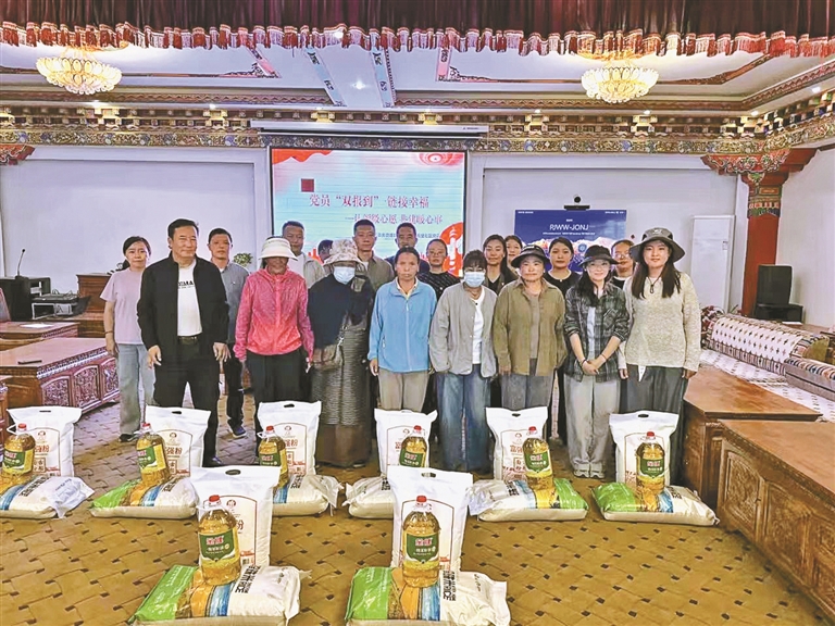 འདི་ནི་སྐུ་འབུམ་ཐང་སྡེ་ཁུལ་གྱིས་ལྷ་ས་གྲོང་ཁྱེར་ལས་ཁུངས་ལས་དོན་དོ་དམ་ཅུས་དང་མཉམ་དུ་དཀའ་ངལ་ཡོད་པའི་མང་ཚོགས་དུད་ཚང་8ལ་འབྲས་དང་། སྣུམ། གྲོ་ཞིབ་སོགས་འཚོ་བའི་དངོས་ཟོག་སྤྲོད་བཞིན་པ།