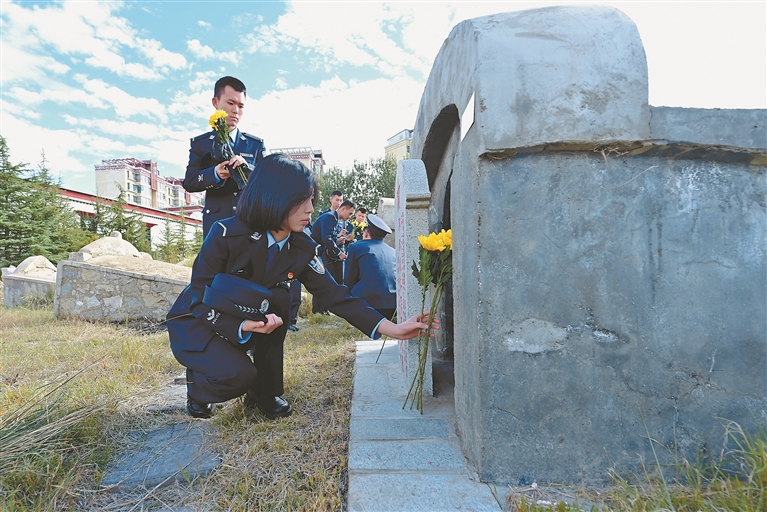 འདི་ནི་ལྷ་ས་གྲོང་ཁྱེར་དམག་ཞབས་ཐིམ་པའི་དམག་མིའི་ལས་དོན་ཅུས་ཀྱི་ཏང་ཡོན་ལས་བྱེད་པས་སྔོན་གཤེགས་དཔའ་བོའི་བང་སོའི་སྐྱེད་ཚལ་གྱི་དྲན་གསོ་ཁང་དུ་ལྟ་སྐོར་བྱེད་བཞིན་པ།