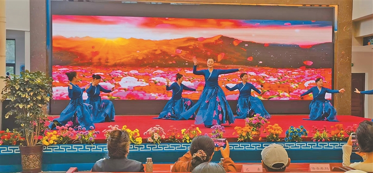 ཉིན་ཤས་གོང“རྒྱལ་སྟོན་དགའ་གཏོང་བྱེད། དྲུག་ཅུ་དབུ་དཀར་གྱིས་རྒྱལ་སྟོན་ལ་བསྟོད་གླུ་ཕུལ། བོད་རང་སྐྱོང་ལྗོངས་དབུ་བརྙེས་ནས་ལོ་ངོ་དྲུག་ཅུ་འཁོར་བར་རྟེན་འབྲེལ་ཞུ”ཞེས་པའི་བྱེད་སྒོ་ལྷ་ས་གྲོང་ཁྱེར་ཁྲེང་ཀོན་ཆུས་རྒན་རྒོན་ཉིན་མོའི་ལྟ་རྟོག་ལྟེ་གནས་སུ་སྤེལ་བ་དང་། འཁྲབ་སྟོན་པ་ཚོས་སྤྲོ་སྣང་ལྡན་པའི་གླུ་དབྱངས་དང་ཉམས་འགྱུར་ལྡན་པའི་གར་སྟབས་ཀྱི་ཐོག་ནས་མེས་རྒྱལ་ལ་དགའ་ཞེན་དང་མཛེས་སྡུག་ལྡན་པའི་འཚོ་བར་བསྔགས་བརྗོད་བྱེད་པའི་བརྩེ་བ་ཟབ་མོ་མཚོན་པར་བྱས་ཡོད། འདི་ནི་འཁྲབ་སྟོན་པས་ཁྲའོ་ཞན་གྱི་ཞབས་བྲོ《ཉི་མའི་འོད་ཟེར་མཐའ་མཚམས་ཕྱོགས་སུ་འཕྲོ》འཁྲབ་བཞིན་པ།