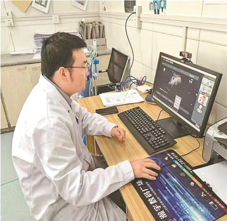 འདི་ནི་མངའ་རིས་ས་ཁུལ་མི་དམངས་སྨན་ཁང་གི་བོད་སྐྱོར་སྨན་པས་མངའ་རིས་ས་ཁུལ་སྨན་རྩིས་ཁང་གི་སྨན་པར་Bསྒྲ་རླབས་ཀྱི་བརྙན་པར་མཉམ་སྤྱོད་བྱེད་བཞིན་པ།