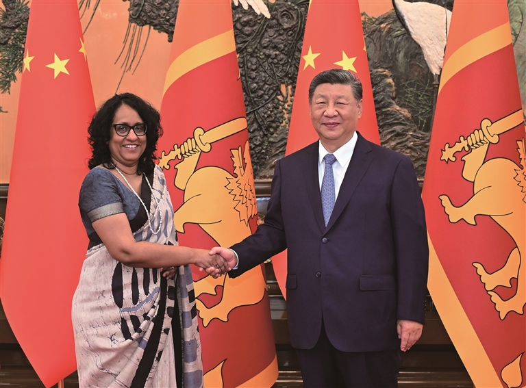 ཞི་ཅིན་ཕིང་གིས་ནན་བཤད་གནང་དོན། སི་རི་ལན་ཁ་ཕྱོགས་ཀྱིས་རྒྱལ་ཁབ་ཀྱི་བདག་དབང་དང་། རང་བཙན། མངའ་ཁོངས་ས་ཆ་ཆ་ཚང་བཅས་སྲུང་སྐྱོང་དང་། རང་ངོས་ཀྱི་རྒྱལ་ཁབ་ཀྱི་གནས་ཚུལ་དང་མཐུན་པའི་འཕེལ་རྒྱས་འགྲོ་ལམ་དུ་བསྐྱོད་པ། དཔལ་འབྱོར་འཕེལ་རྒྱས་ལ་དམིགས་པ་བཅས་བྱས་ནས་རྒྱལ་ཁབ་སྟོབས་ལྡན་ཡོང་བ་བྱེད་པར་ཀྲུང་གོ་ཕྱོགས་ཀྱིས་རྒྱབ་སྐྱོར་བྱ་རྒྱུ་ཡིན། ཀྲུང་གོ་ཕྱོགས་ཀྱིས་སི་རི་ལན་ཁ་ཕྱོགས་དང་སྤུས་ཚད་མཐོ་པོས“རྒྱུད་གཅིག་ལམ་གཅིག”མཉམ་སྐྲུན་བྱས་ཏེ་གྲུ་ཁའི་དཔལ་འབྱོར་དང་། དེང་རབས་ཞིང་ལས། གྲངས་འཛིན་དཔལ་འབྱོར། ལྗང་མདོག་དཔལ་འབྱོར། ཡུལ་སྐོར་སོགས་ཀྱི་མཉམ་ལས་ཐུན་མོང་ཐོག་རྒྱ་སྐྱེད་བཏང་ནས། སི་རི་ལན་ཁའི་དཔལ་འབྱོར་དང་སྤྱི་ཚོགས་འཕེལ་རྒྱས་ལ་རོགས་རམ་བྱེད་འདོད་ཡོད། ཕྱོགས་གཉིས་པོས་ཁྲིམས་སྒྱུར་བདེ་འཇགས་མཉམ་ལས་ལ་ཤུགས་སྣོན་བརྒྱབ་ནས་རྒྱལ་སྒྲོལ་རྒྱན་འགྱེད་དང་ཁ་བསླུས་སོགས་ཉེས་གསོག་བྱེད་སྤྱོད་ལ་རྡུང་རྡེག་མཐའ་གཅིག་ཏུ་གཏོང་དགོས། མཉམ་འབྲེལ་རྒྱལ་ཚོགས་སོགས་ཕྱོགས་མང་སྒྲོམ་གཞིའི་ནང་གི་མཐུན་སྦྱོར་དང་མཉམ་ལས་ལ་ཤུགས་སྣོན་བརྒྱབ་ནས། འདྲ་མཉམ་དང་གོ་རིམ་ལྡན་པའི་འཛམ་གླིང་སྣ་མང་ཅན་དང་། ཀུན་ཕན་བསྟུན་མཁས་ཀྱི་དཔལ་འབྱོར་གོ་ལ་ཧྲིལ་པོ་ཅན་ལ་སྐུལ་འདེད་བཏང་སྟེ། གོ་ལ་ཧྲིལ་པོའི་ལྷོ་ཕྱོགས་ཀྱི་ཐུན་མོང་ཁེ་ཕན་ལ་སྲུང་སྐྱོང་བརྟན་པོ་བྱེད་དགོས།