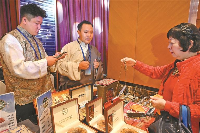 ད་ལོ་ནི་བོད་རང་སྐྱོང་ལྗོངས་དབུ་བརྙེས་ནས་ལོ་ངོ་60འཁོར་བའི་ལོ་དང་ཀྲུང་གོ་དང་ནེ་པ་ལའི་དབར་ཕྱི་འབྲེལ་བཙུགས་ནས་ལོ་70འཁོར་བའི་ལོ་ཞིག་ཡིན་སྟབས། ད་རེས་བོད་ཀྱིས་ཐེངས་དང་པོར“རྒྱལ་སྤྱིའི་མཛའ་གྲོགས་གྲོང་ཁྱེར”ཡིན་པའི་ངོས་ནས་འགྲེམས་སྟོན་བྱས་ཡོད། ངོ་སྤྲོད་བྱས་པར་གཞིགས་ན། འགྲེམས་ཁང་གིས“ཀྲུང་ནེའི་མཛའ་གྲོགས། དར་གོས་ལམ་བུར་སེམས་པ་གཅིག་ཏུ་སྒྲིལ། ཚོང་ལམ་འབྱུང་འགྱུར་ལ་ཕྱོགས”ཞེས་པ་བརྗོད་དོན་གཙོ་བོར་བྱས་ནས་དེང་རབས་ཀྱི་འགྲེམས་སྟོན་ལག་རྩལ་དང་། ཡིག་རིས། ཅ་དངོས་སོགས་འགྲེམས་སྟོན་བྱེད་སྟངས་ཐོག་ནས་བོད་ལྗོངས་ཀྱིས་ཕྱི་ཕྱོགས་དཔལ་འབྱོར་མཉམ་ལས་སྤེལ་རེས་ཀྱི་རྨད་དུ་བྱུང་བའི་གྲུབ་འབྲས་མངོན་པར་བྱས་ཡོད། ནེ་པ་ལ་ནས་འོང་བའི་ཚོང་པ་ལཱ་པིན་ལཱ་ཡི་ཁྱིམ་མིས་ལོ་ཕྱེད་ཙམ་བཟོས་པའི་ལག་ཤེས་ཐོན་རྫས་ཕ་ལམ་ཆེད་མངགས་ཁྱེར་ཡོད། ཁོང་གིས“ད་རེས་ཀྱི་འགྲེམས་ཚོགས་ཀྱི་ལས་སྟེགས་ཆེན་པོ་འདི་བརྒྱུད་འཛམ་གླིང་ལ་ང་ཚོའི་བཟོ་བོའི་ལག་ཤེས་ངོ་སྤྲོད་བྱེད་ཀྱི་ཡིན”ཞེས་བཤད།