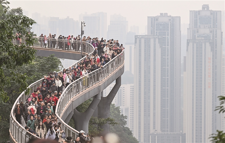 ཉེ་ཆར། ཁྲུང་ཆིང་གི་རི་སྐེད་ཨེ་ལིང་འཕྲང་ཟམ་དངོས་སུ་སྤྱོད་འགོ་ཚུགས་ཤིང་། འཕྲང་ཟམ་དེའི་སྤྱིའི་རིང་ཚད་ལ་སྨི་460དང་། ཞེང་ཚད་ལ་སྨི་3 མཐོ་ཚད་ལ་སྨི་28ཡོད་པ་རེད། རི་ལྡེབས་སུ་བསྐྲུན་ཏེ་ཨེ་ལིང་སྤྱི་གླིང་དང་ཧྥུའུ་ཐུའུ་ཀོན་སྤྱི་གླིང་ཡུག་གཅིག་ཏུ་སྦྲེལ་ཡོད་པ་དང་། དེ་ནས་ལྟ་བས་མི་ངོམ་པའི་གཙང་པོའི་མཛེས་ལྗོངས་ལ་མྱོང་རོལ་བྱེད་ཆོག་པས། དེ་ནི་ཁྲུང་ཆིང་ཡུལ་སྐོར་གྱི་ས་ཁམས་མཚོན་རྟགས་གསར་པ་ཞིག་ཏུ་གྱུར་ཡོད་ཅིང་། འདི་ནི་མི་མང་པོས་ཟམ་སྟེང་ནས་ཡུལ་ལྗོངས་ལ་ལྟ་བཞིན་པ།