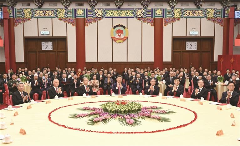 ཤིན་ཧྭ་གསར་འགྱུར་ཁང་པེ་ཅིང་ནས་གློག་འཕྲིན་འབྱོར་གསལ། 2025ལོའི་ཟླ་12ཚེས་31ཉིན་གྱི་སྔ་དྲོར། ཀྲུང་གོ་མི་དམངས་ཆབ་སྲིད་གྲོས་མོལ་ཚོགས་འདུ་རྒྱལ་ཡོངས་ཨུ་ཡོན་ལྷན་ཁང་གིས་རྒྱལ་ཡོངས་སྲིད་གྲོས་ཀྱི་ཚོགས་ཁང་དུ་ལོ་གསར་གྱི་ཇ་སྟོན་ཚོགས་འདུ་འཚོགས་པ་རེད། ཏང་དང་རྒྱལ་ཁབ་ཀྱི་འགོ་ཁྲིད་པ་ཞི་ཅིན་ཕིང་དང་། ལི་ཆང་། ཀྲའོ་ལེ་ཅི། ཝང་ཧུའུ་ཉིང་། ཚའེ་ཆི། ཏིང་ཤུའེ་ཞང་། ལི་ཞི། ཧན་ཀྲེང་སོགས་ཀྱིས་དམངས་གཙོ་ཏང་ཤོག་ཁག་གི་ཀྲུང་དབྱང་དང་རྒྱལ་ཡོངས་བཟོ་ཚོང་ལས་རིགས་མཉམ་འབྲེལ་ལྷན་ཚོགས་ཀྱི་འགན་འཁུར་བ། ཏང་ཤོག་གང་ལའང་མི་གཏོགས་པའི་མི་སྣའི་འཐུས་མི། ཀྲུང་དབྱང་དང་རྒྱལ་ཁབ་ལས་ཁུངས་ཀྱི་འབྲེལ་ཡོད་ཕྱོགས་ཀྱི་འགན་འཁུར་བ། དེ་བཞིན་རྒྱལ་སའི་མི་རིགས་ཁག་དང་ལས་རིགས་ཁག་གི་མི་སྣའི་འཐུས་མི་བཅས་དང་ལྷན་དུ་དགའ་སྤྲོ་མཉམ་འཛོམས་ཀྱིས་2026ལོའི་གནམ་ལོ་གསར་ཚེས་ལ་བསུ་བ་ཞུས་པ་རེད།