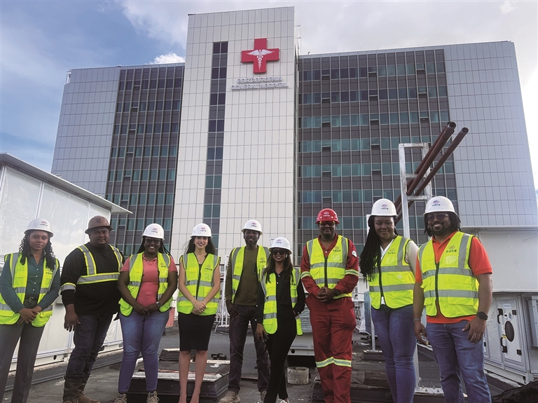 འདི་ནི་ཧྲ་ལཱ(གཡོན་གྱི་གསུམ་པ)ཡིས་ས་གནས་དེ་གའི་ལས་རོགས་དང་མཉམ་དུ་ཀྲུང་གོའི་ཁེ་ལས་ཀྱིས་སྐྲུན་འགན་འཁུར་བའི་སི་ཕེན་གྲུ་ཁ་སྤྱི་ཁྱབ་སྨན་ཁང་གི་ལྟེ་བའི་བ་གམ་གྱི་མདུན་དུ་མཉམ་པར་རྒྱག་བཞིན་པ།
