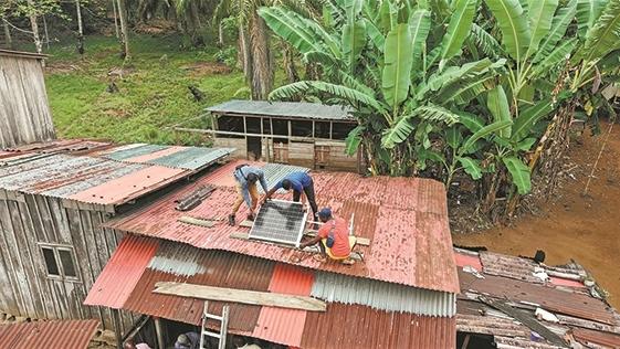 སོ་ཐོ་མེ་དང་ཕུ་རིན་སི་ཕེ་ཡི་ལས་དོན་པས་ཡུལ་མིའི་ཁང་པའི་ཐོག་ཁར་ཉི་ནུས་ཤེལ་ལེབ་སྒྲིག་སྦྱོར་བྱེད་བཞིན་པ།(སྐྱེ་ཁམས་ཁོར་ཡུག་པུའི་ཕྱི་ཕྱོགས་མཉམ་ལས་དང་སྤེལ་རེས་ལྟེ་གནས་ཀྱིས་མཁོ་འདོན་བྱས་པ)