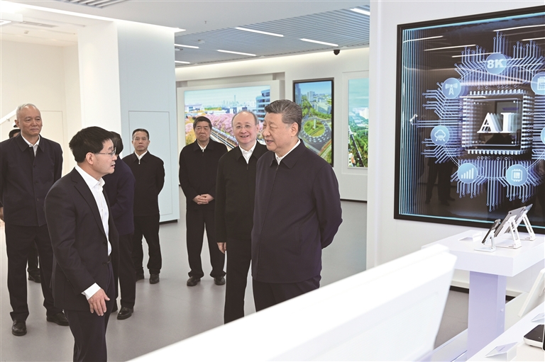 ཚེས་9ཉིན་གྱི་སྔ་དྲོར། ཞི་ཅིན་ཕིང་གིས་པེ་ཅིང་དབྱི་ཀྲོང་དུ་རྒྱལ་ཁབ་ཆ་འཕྲིན་ལག་རྩལ་བཀོལ་སྤྱོད་གསར་གཏོད་ཐོན་ལས་གླིང་དུ་རྟོག་ཞིབ་གནང་བཞིན་པ།