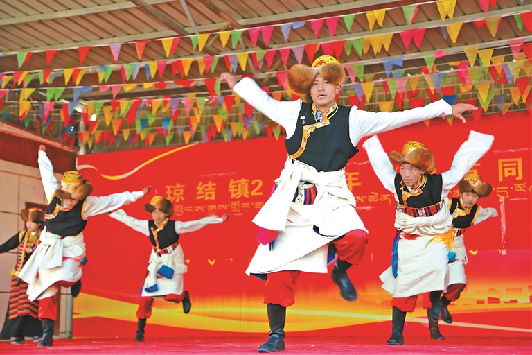 འདི་ནི་ལྷོ་ཁ་གྲོང་ཁྱེར་འཕྱོངས་རྒྱས་རྫོང་འཕྱོངས་རྒྱས་གྲོང་རྡལ་དུ“དུས་ཆེན་གཉིས་ལ་མཉམ་རོལ། སེམས་མཐུན་ཕུགས་འདུན་མཉམ་གཏོད”ཅེས་པའི་གནམ་ལོ་གསར་ཚེས་ཀྱི་མཉམ་སྤྲོའི་བྱེད་སྒོ་སྤེལ་བཞིན་པ།