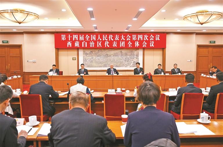 སྲིད་གཞུང་གི་ལས་དོན་སྙན་སྒྲོན་ལ་གྲོས་ཞིབ་དང“ལོ་ལྔ་ཚན་བཅོ་ལྔ་པའི”འཆར་འགོད་རྩ་གནད་ཀྱི་འཆར་ཟིན་ལ་ཞིབ་བཤེར་གནང་སྐབས། འཐུས་མི་ཡན་ཅིན་ཧའེ་དང་། ལིན་རུའེ། ཝང་ཧུང་ཞང་། ཝང་ཝུའེ་ཏུང་། ཝང་ཧྥང་ཧུང་། ནོར་བུ་གཡང་འཛོམས། བློ་བཟང་རྒྱལ་མཚན། ཀརྨ་ཚེ་བརྟན། བསོད་ནམས་བསྟན་འཛིན། ཝང་ཆང་། བཀྲ་ཤིས་རྒྱལ་མཚན་སོགས་ཀྱིས་སྔ་རྗེས་སུ་གཏམ་བཤད་སྤེལ་བ་དང་། ཚང་མས། “ལོ་ལྔ་ཚན་བཅོ་ལྔ་པའི”འཆར་འགོད་རྩ་གནད་ཀྱི་འཆར་ཟིན་ནང་། ཏང་གི་སྐབས་ཉི་ཤུ་པའི་ཀྲུང་ཨུ་ཚང་འཛོམས་གྲོས་ཚོགས་ཐེངས་བཞི་པའི་དགོངས་དོན་ཕྱོགས་ཡོངས་ནས་དོན་འཁྱོལ་བྱས་ཏེ། དོན་དངོས་ནས་འགོ་འཛུགས་པ་དང་ཆོས་ཉིད་ལྟར་བྱ་བ་སྒྲུབ་རྒྱུ་མཐའ་འཁྱོངས་དང་། སྤུས་ཚད་མཐོ་བའི་འཕེལ་རྒྱས་ཀྱི་བརྗོད་དོན་གཙོ་བོར་དམ་པོར་དམིགས་པ། རྒྱང་ལྟའི་རང་བཞིན་གྱི་སྒོ་ནས་གནད་དོན་ཁོང་དུ་ཆུད་པ་དང་སྟོབས་ཤུགས་གཅིག་སྡུད་ཀྱིས་གནད་དོན་ཐག་གཅོད་བྱ་རྒྱུ་ཟུང་འབྲེལ་ཡག་པོ། མི་དམངས་ཐུན་མོང་གི་བློ་གྲོས་གཅིག་ཏུ་བསྡུས་པ། མི་དམངས་ཀྱི་སྟོབས་ཤུགས་ཆེན་པོ་སྐུལ་སློང་བྱས་ཡོད་པས་མི་དམངས་ལ་རང་ཁྱིམ་རང་བདག་གང་ལེགས་བྱུང་བ་མངོན་ཡོད། དེ་ནི་བརྒྱུད་རིམ་ཧྲིལ་པོའི་མི་དམངས་དམངས་གཙོ་འཕེལ་རྒྱས་གཏོང་བའི་མཚོན་ཚུལ་དངོས་ཡིན་པས། རང་རྒྱལ་གྱི་དཔལ་འབྱོར་དང་སྤྱི་ཚོགས་སྤུས་ཚད་མཐོ་བའི་འཕེལ་རྒྱས་ལ་སྐུལ་འདེད་གཏོང་བ་དང་སྤྱི་ཚོགས་རིང་ལུགས་དེང་རབས་ཅན་གཞི་རྩའི་ཆ་ནས་མངོན་འགྱུར་བྱེད་པར་རྨང་གཞི་དེ་བས་བརྟན་པོ་འདིང་བར་གལ་ཆེ་ཞིང་གཏིང་ཟབ་པའི་དོན་སྙིང་ལྡན་ཡོད། “ལོ་ལྔ་ཚན་བཅོ་ལྔ་པའི”འཆར་འགོད་རྩ་གནད་ཀྱི་འཆར་ཟིན་ལ་རྦད་དེ་མོས་མཐུན་ཡོད་ཅེས་གསུངས་པ་མ་ཟད། དོན་དངོས་དང་ཟུང་འབྲེལ་གནང་ནས་བསམ་འཆར་དང་གྲོས་འགོའང་བཏོན་གནང་བ་རེད།