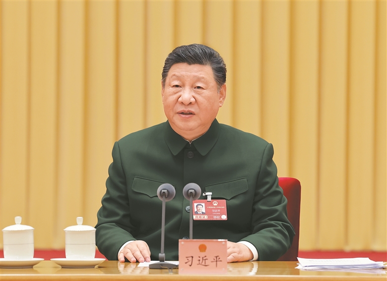ཤིན་ཧྭ་གསར་འགྱུར་ཁང་པེ་ཅིང་ནས་ཟླ་3ཚེས་7ཉིན་གློག་འཕྲིན་འབྱོར་གསལ། ཚེས་7ཉིན་གྱི་ཕྱི་དྲོར། ཀྲུང་གུང་ཀྲུང་དབྱང་གི་སྤྱི་ཁྱབ་ཧྲུའུ་ཅི་དང་། རྒྱལ་ཁབ་ཀྱི་ཀྲུའུ་ཞི། ཀྲུང་དབྱང་དམག་ཨུད་ཀྱི་ཀྲུའུ་ཞི་བཅས་ཡིན་པའི་ཞི་ཅིན་ཕིང་གིས་རྒྱལ་ཡོངས་མི་དམངས་འཐུས་ཚོགས་སྐབས་བཅུ་བཞི་པའི་ཚོགས་འདུ་ཐེངས་བཞི་པའི་བཅིངས་འགྲོལ་དམག་དང་དྲག་ཆས་ཉེན་རྟོག་དཔུང་སྡེའི་འཐུས་མི་ཚོགས་པའི་ཚང་འཛོམས་གྲོས་ཚོགས་ལ་ཞུགས་སྐབས་ནན་བཤད་གནང་དོན། “ལོ་ལྔ་ཚན་བཅོ་ལྔ་པའི”རིང་། དམག་དཔུང་བཙུཌ་ནས་ལོ་བརྒྱ་འཁོར་བའི་འབད་འཐབ་དམིགས་ཚད་དུས་བཀག་ལྟར་མངོན་འགྱུར་བྱེད་པ་དང་རྒྱལ་སྲུང་དང་དམག་དཔུང་དེང་རབས་ཅན་ལ་སྤུས་ཚད་མཐོ་པོས་སྐུལ་འདེད་གཏོང་བར། ངེས་པར་དུ་ཆབ་སྲིད་ལ་བརྟེན་ནས་དམག་དཔུང་འཛུགས་སྐྱོང་བྱེད་པའི་ཐབས་མཆོག་གལ་ཆེན་དེ་མཐའ་འཁྱོངས་ཡག་པོ་དང་། བེད་སྤྱོད་ཡག་པོ་གཏོང་བ། འཕེལ་རྒྱས་ཡག་པོ་བཅས་བཏང་ནས། ཏང་གིས་དམག་དཔུང་ལ་འགོ་ཁྲིད་གཙང་བཙན་བྱེད་པར་གཡོ་འགུལ་སྤུ་ཙམ་ཡང་མི་གཏོང་བར་མཐའ་འཁྱོངས་བྱེད་པ་དང་འབྲེལ་དེར་ཤུགས་སྣོན་ཡང་རྒྱག་པ་དང་། ཆབ་སྲིད་ལ་བརྟེན་ནས་དམག་དཔུང་འཛུགས་སྐྱོང་བྱེད་པའི་དམིགས་བསལ་གྱི་ལེགས་ཆ་འདོན་སྤེལ་གང་ལེགས་བྱས་ཏེ། སེམས་ཤུགས་གཅིག་ཏུ་བསྒྲིལ་ནས་རྒྱལ་སྲུང་དང་དམག་དཔུང་དེང་རབས་ཅན་བརྟན་བགྲོད་རྒྱང་འཁྱོལ་ཐུབ་པར་སྐུལ་འདེད་གཏོང་དགོས།