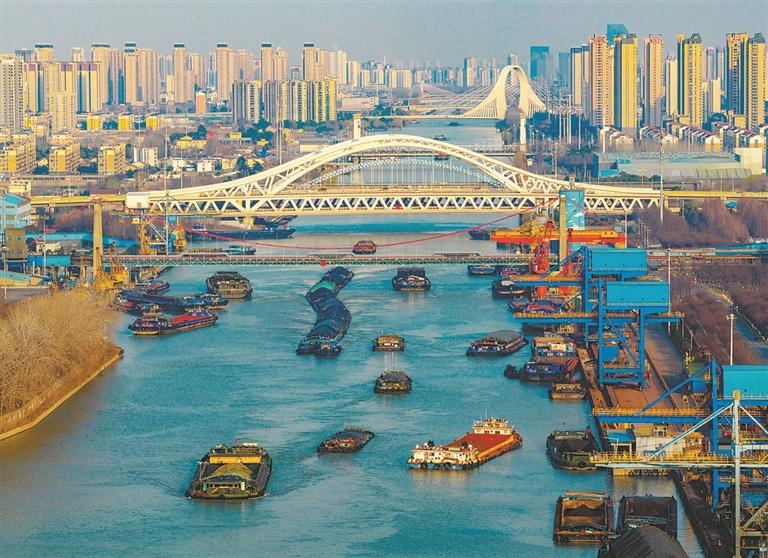 ཅིང་ཧང་མིས་བཟོས་གཙང་པོར་རྡོ་སོལ་དང་། ཞིང་སྤྱོད་རྒྱུ་ཆ། ཨར་ལས་རྒྱུ་ཆ་སོགས་དངོས་ཟོག་སྣ་ཚོགས་བླུགས་པའི་ཟོག་འདྲེན་གྲུ་གཟིངས་ཕར་འགྲོ་ཚུར་འོང་བྱས་ནས་བྲེལ་བརྩོན་གྱི་རྣམ་པས་ཁེངས་ཤིང་། འདི་ནི་ཅིང་ཧང་མིས་བཟོས་གཙང་པོའི་ཅང་སུའུ་ཧོའེ་ཨན་དུམ་བུར་སྐྱོད་བཞིན་པའི་གྲུ་གཟིངས་ཡིན་པ།