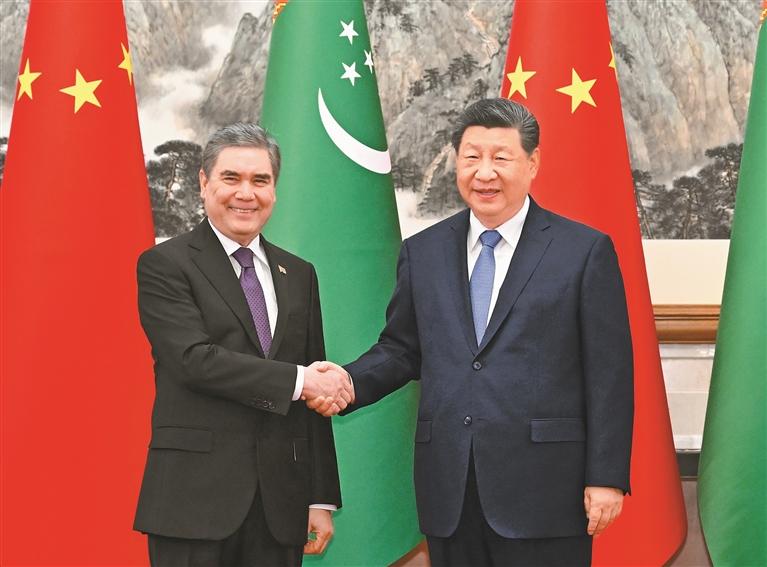 ཞི་ཅིན་ཕིང་གིས་ནན་བཤད་གནང་དོན། ཕན་ཚུན་རྒྱབ་སྐྱོར་བྱ་རྒྱུ་ནི་ཀྲུང་གོ་དང་ཏུར་མེན་སི་ཐན་གྱི་ཕྱོགས་ཡོངས་ཀྱི་འཐབ་ཇུས་རོགས་ཟླའི་འབྲེལ་བའི་སྲོག་ཤིང་གི་དོན་སྙིང་ཡིན། རྒྱལ་སྤྱིའི་དུས་བབ་ལ་འགྱུར་ལྡོག་ཇི་ལྟར་བྱུང་རུང་། ཏུར་མེན་སི་ཐན་ཕྱོགས་ཀྱིས་རྒྱལ་ཁབ་ཀྱི་རང་བཙན་དང་། བདག་དབང་། མངའ་ཁོངས་ས་ཆ་ཆ་ཚང་བཅས་སྲུང་སྐྱོང་བྱེད་པར་ཀྲུང་གོ་ཕྱོགས་ཀྱིས་ཐོག་མཐའ་བར་གསུམ་དུ་རྒྱབ་སྐྱོར་བྱ་རྒྱུ་མ་ཟད། ཏུར་མེན་སི་ཐན་ཕྱོགས་ཀྱིས་ཡུན་རིང་བར་གནས་སྲིད་ཇུས་ལག་བསྟར་བྱེད་པར་ཐོག་མཐའ་བར་གསུམ་དུ་རྒྱབ་སྐྱོར་བྱེད་ཀྱི་ཡིན་ལ། ཏུར་མེན་སི་ཐན་ཕྱོགས་ཀྱིས་བློས་འགེལ་ཆོག་པའི་མཉམ་ལས་རོགས་ཟླ་ཞིག་ཀྱང་བྱེད་ཀྱི་ཡིན། ཕྱོགས་གཉིས་པོས“རྒྱུད་གཅིག་ལམ་གཅིག”མཉམ་སྐྲུན་གྱི་གྲོས་འགོ་དང“བསྐྱར་དར་གྱི་དར་གོས་ལམ་བུའི”འཐབ་ཇུས་སྦྲེལ་མཐུད་ལ་མགྱོགས་མྱུར་སྐུལ་འདེད་གཏོང་བ་དང་། རང་བྱུང་སོལ་རླངས་ཁྱབ་ཁོངས་ཀྱི་མཉམ་ལས་གཞི་ཁྱོན་ཆེ་རུ་གཏོང་བ། ཚོང་དོན་དང་མ་འཇོག་ཆུ་ཚད་མཐོ་རུ་གཏོང་བ། ཕན་ཚུན་སྦྲེལ་མཐུད་དང་། ཞིང་ལས། མི་ཐབས་རིག་ནུས། གྲངས་འཛིན་དཔལ་འབྱོར། ནུས་རྒྱུ་གཙང་མ་སོགས་ཐོན་ཁུངས་མིན་པའི་ཁྱབ་ཁོངས་ཀྱི་མཉམ་ལས་རྒྱ་ཆེར་གཏོང་བ། ལུའུ་པན་བཟོ་ཁང་དང་། ཀྲུང་ལུགས་གསོ་རིག་སྨན་རྫས་ལྟེ་གནས། ཕན་ཚུན་གཉིས་ཀར་རིག་གནས་ལྟེ་གནས་འཛུགས་པ་བཅས་ཀྱི་ལས་དོན་ལ་སྐུལ་འདེད་མགྱོགས་སུ་གཏོང་བ་བཅས་བྱས་ཏེ་ཕྱོགས་ཡོངས་མཉམ་ལས་ཀྱི་བཀོད་པ་གསར་པ་གཏོད་དགོས། “ངན་ཤུགས་གསུམ”ལ་རྡུང་རྡེག་མཐའ་གཅིག་ཏུ་བཏང་ནས་རྒྱལ་ཁབ་གཉིས་པོའི་འཕེལ་རྒྱས་ཆེད་བདེ་འཇགས་ཀྱི་སྲུང་བཅད་བརྟན་པོ་སྐྲུན་དགོས། མིག་སྔར། གོ་ལ་ཧྲིལ་པོར་འགྲན་སློང་རྒྱུན་ཆད་མེད་པར་ཐོན་བཞིན་ཡོད་པས་ཀྲུང་གོ་ཕྱོགས་ཀྱིས་ཏུར་མེན་སི་ཐན་ཕྱོགས་དང་མཉམ་དུ་མཉམ་འབྲེལ་རྒྱལ་ཚོགས་ཀྱི་གནས་བབ་དང་དབང་གྲགས་སྲུང་སྐྱོང་མཐའ་གཅིག་ཏུ་བྱེད་པ་དང་། ཕྱོགས་མང་རིང་ལུགས་ངོ་མ་ལག་བསྟར། མཉམ་གྲོས་མཉམ་སྐྲུན་མཉམ་སྤྱོད་བཅས་ཀྱི་གོ་ལ་ཧྲིལ་པོའི་བཅོས་སྐྱོང་ལྟ་བ་མཐའ་འཁྱོངས་བཅས་བྱས་ཏེ་དྲང་གཞག་དྲང་བདེན་དང་སྒོ་དབྱེ་བསྟུན་མཁས་ཀྱི་འདུ་ཤེས་ལ་བརྟེན་ནས་གོ་ལ་ཧྲིལ་པོའི་བཅོས་སྐྱོང་རྩ་འགྱུར་ལ་སྣེ་ཁྲིད་བྱེད་འདོད་ཡོད།