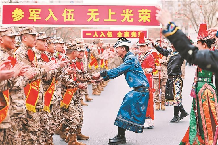 འདི་ནི་ཟླ་3ཚེས་16ཉིན་ཀན་སུའུ་ཀྲང་ཡེ་གྲོང་ཁྱེར་གྱི་དམག་མི་གསར་པ་དམག་དཔུང་ནང་ཞུགས་པའི་མཛད་སྒོའི་ཐོག་མང་ཚོགས་དང་དམག་གསར་ཚོས་ཕན་ཚུན་མཉམ་འགུལ་སྤེལ་རེས་བྱེད་བཞིན་པ།