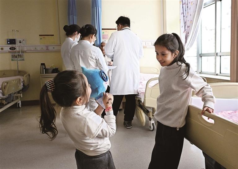 ཉེ་ཆར། “ཧྲང་ཧའེ་མཉམ་ལས་རྩ་འཛུགས་ཀྱིས་ཐ་ཇིག་སི་ཐན་ལ་བརྩེ་བ་འཆང་བའི་བྱ་སྤྱོད”སྤེལ་འགོ་ཚུགས་པ་དང་བསྟུན། ཐ་ཇིག་སི་ཐན་ནས་ཡིན་པའི་ལྷན་སྐྱེས་སྙིང་ནད་ཕོག་པའི་བྱིས་པ་9ཆིང་ཏའོ་གྲོང་ཁྱེར་གྱི་བུད་མེད་དང་བྱིས་པའི་སྨན་ཁང་དུ་འབྱོར་ནས་སྨན་བཅོས་ཀྱི་གྲ་སྒྲིག་བྱེད་བཞིན་ཡོད་པ་རེད། འདི་ནི་ཆིང་ཏའོ་གྲོང་ཁྱེར་བུད་མེད་དང་བྱིས་པའི་སྨན་ཁང་གི་ནད་ཁང་དུ་སྨན་བཅོས་བྱ་རྒྱུར་སྒུག་པའི་ཕྲུ་གུ་གཉིས་རྩེད་མོ་རྩེ་བཞིན་པ།