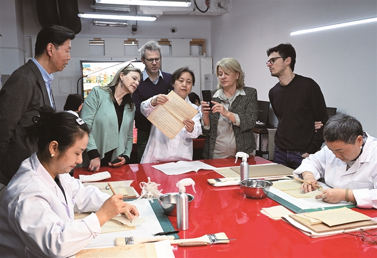 འདི་ནི་ཀྲུང་གོ་དང་དབྱི་ཐ་ལིའི་རིག་གནས་ཤུལ་བཞག་སྲུང་སྐྱོང་ཉམས་གསོའི་རྒྱལ་སྤྱིའི་གྲལ་སྒོར་ཚོགས་འདུར་ཞུགས་མཁན་དབྱི་ཐ་ལིའི་ཕྱོགས་ཀྱི་རིགས་གཅིག་མཁས་ཅན་གྱིས་པེ་ཅིང་དུ་གནས་པའི་ཀྲུང་གོའི་ལོ་རྒྱུས་ཞིབ་འཇུག་ཁང་དཔེ་དེབ་དང་ཡིག་ཚགས་ཁང་གི་ཚད་ལྡན་ཡིག་ཚགས་ཉམས་གསོ་ཁང་དུ་ཡོང་ནས་དེར་ཉར་ཚགས་བྱས་པའི་དཔེ་རྙིང་ཉམས་གསོ་བྱ་ཚུལ་ལ་ཤེས་རྟོགས་བྱེད་བཞིན་པ།