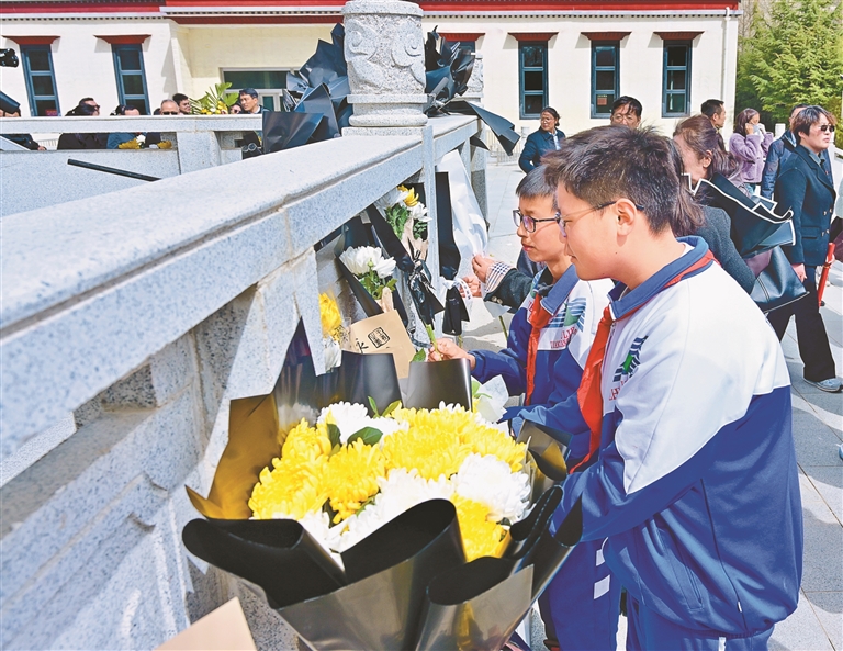 འདི་ནི་ལྷ་ས་གྲོང་ཁྱེར་སློབ་འབྲིང་བརྒྱད་པའི་སློབ་མས་ལྷ་སའི་སྔོན་གཤེགས་དཔའ་བོའི་བང་སོའི་སྐྱེད་ཚལ་དུ་གསར་བརྗེའི་སྔོན་གཤེགས་དཔའ་བོའི་དྲན་གསོའི་རྡོ་རིང་མདུན་དུ་མེ་ཏོག་སོས་པ་འབུལ་བཞིན་པ།