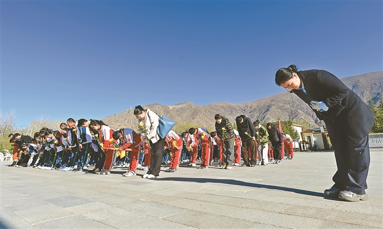 འདི་ནི་ལྷ་ས་གྲོང་ཁྱེར་གྱི་སློབ་གྲྭ་འབྲིང་ཆུང་གི་སློབ་མའི་འཐུས་མིས་ལྷ་སའི་སྔོན་གཤེགས་དཔའ་བོའི་བང་སོའི་སྐྱེད་ཚལ་དུ་གསར་བརྗེའི་སྔོན་གཤེགས་དཔའ་བོའི་དྲན་གསོའི་རྡོ་རིང་མདུན་དུ་དད་གུས་ཆེན་པོས་གུས་འདུད་ཞུ་བཞིན་པ།
