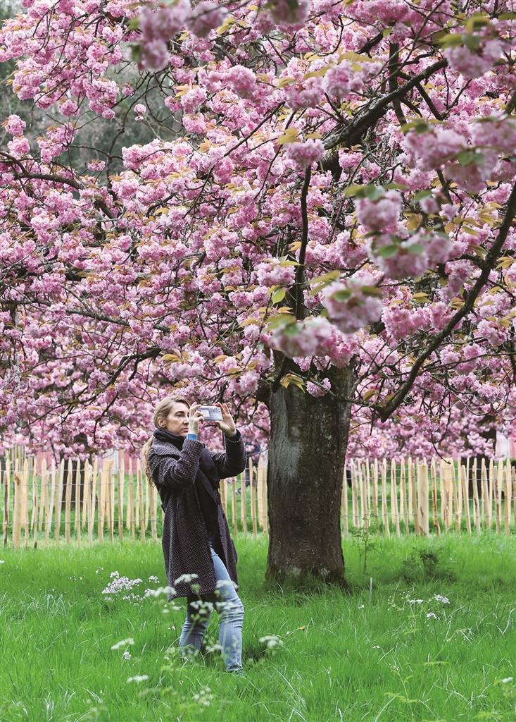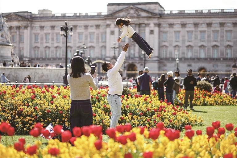 དབྱིན་ཇིའི་ལོན་ཏོན་གྱི་པའེ་ཅིན་ཧན་ཕོ་བྲང་ཉེ་འཁོར་དུ་མེ་ཏོག་ཡུས་ཅིན་ཤང་རབ་ཏུ་བཞད་ཅིང་། འདི་ནི་མི་རྣམས་མཛེས་པའི་མེ་ཏོག་ཁྲོད་རྩེད་འཇོར་རོལ་བཞིན་པ།