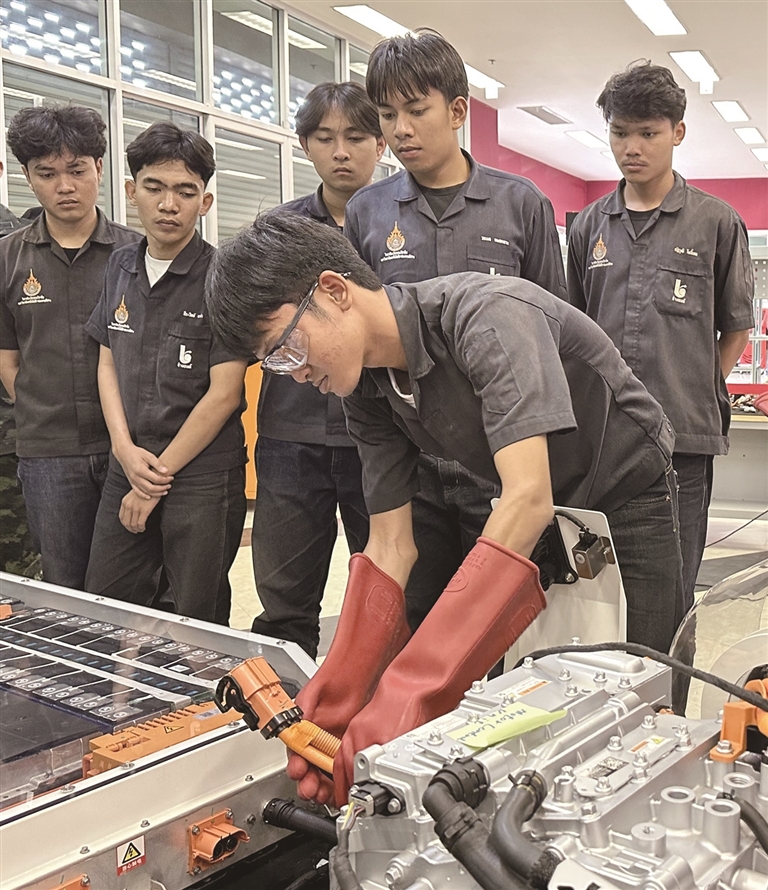 ཐེ་ལན་བྱང་ཤར་གོང་མ་ཚང་རང་བྱུང་བཟོ་སྐྲུན་རིག་པའི་སློབ་ཆེན་གྱི་ནུས་རྒྱུ་གསར་པའི་རླངས་འཁོར་གསོ་སྦྱོང་ལྟེ་གནས་སུ་སློབ་མ་བཅུ་གྲངས་ཁ་ཤས་གློག་སྒུལ་རླངས་འཁོར་ཞིག་གི་འགྲམ་དུ་བསྐོར་ནས་བསྡད་ཡོད། སློབ་མ་ཝ་ཆི་ལ་ཕཱ་ཡིས་ཞིབ་དཔྱད་ཚད་ལེན་ཡོ་བྱད་རླངས་འཁོར་དང་སྦྲེལ་མཐུད་བྱས་མ་ཐག་བརྙན་ཤེལ་ནས་ལྷུ་ལག་ཁག་གི་འཁོར་སྐྱོད་རྣམ་པ་མངོན་ཡོད། ཁོང་གིས་རླངས་འཁོར་ཧྲིལ་པོར་གོ་རིམ་བཞིན་ཞིབ་དཔྱད་ཚད་ལེན་བྱས། “དེ་རིང་གློག་སྒུལ་རླངས་འཁོར་གྱི་བདེ་འཇགས་སྲུང་སྐྱོང་དང་རླངས་འཁོར་ཞིབ་དཔྱད་ཚད་ལེན་སོགས་ཀྱི་ནང་དོན་སློབ་སྦྱོང་བྱས་པ་ཡིན། དངོས་སྦྱོང་དེ་རིགས་ལས་རང་ཉིད་ལ་ལག་རྩལ་ཁོང་དུ་ཆུད་པར་ཕན་ཐོགས་ཆེན་པོ་བྱུང”ཞེས་ཝ་ཆི་ལ་ཕཱ་ཡིས་བརྗོད་པ་རེད།
