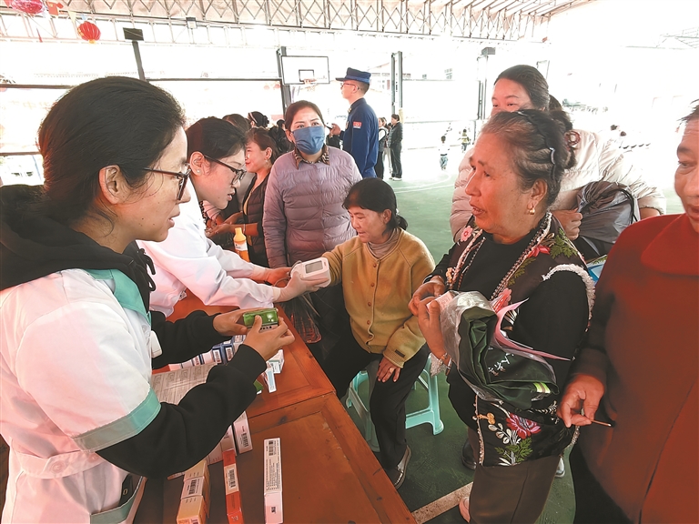 འདི་ནི་མེ་ཏོག་རྫོང་འབྲས་སྤུངས་ཤང་འཕྲོད་བསྟེན་ཁང་གི་སྨན་དོན་མི་སྣས་མང་ཚོགས་ལ་སྨན་སྤྲོད་བཞིན་པ།