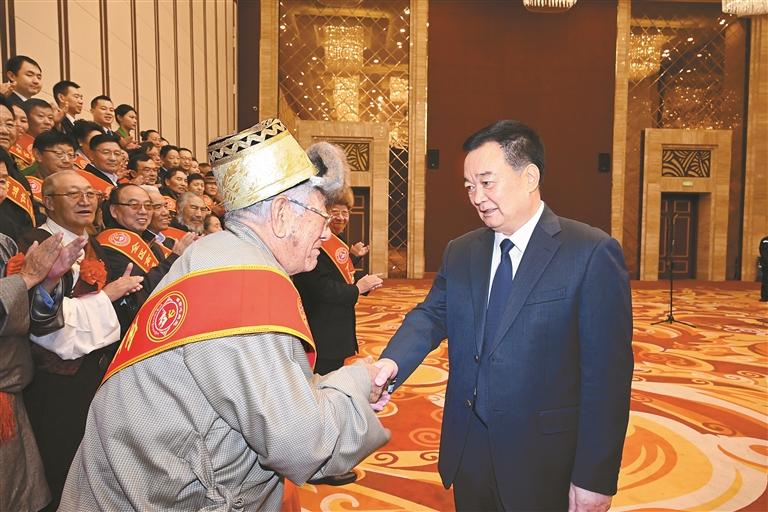 ཝང་ཅུན་ཀྲེང་གིས་རང་སྐྱོང་ལྗོངས་ཏང་ཨུད་ཀྱི་ཚབ་ཞུས་ནས་གཟེངས་བསྟོད་ཐོབ་པའི་སྔོན་ཐོན་མཉམ་སྡེབ་དང་སྔོན་ཐོན་མི་སྒེར་ལ་སྤྲོ་སེམས་འཁོལ་པོས་རྟེན་འབྲེལ་ཞུས་ཏེ། བློ་མཐུན་རྒན་གྲས་ཚོ་དང་དེ་བཞིན་ཁོང་རྣམ་པ་བརྒྱུད་ལྗོངས་ཡོངས་ཀྱི་རྒྱ་ཆེའི་ལས་བྲལ་དང་རྒན་ཡོལ་ཞུས་པའི་ལས་བྱེད་པ་རྣམས་ལ་ལྷག་བསམ་ཟོལ་མེད་ཀྱི་འཚམས་འདྲི་གནང་བ་མ་ཟད། ལྗོངས་ཡོངས་ཀྱི་རྒྱ་ཆེའི་ལས་བྱེད་པ་རྒན་གྲས་དང་ལས་དོན་པར་སྙིང་ཐག་པ་ནས་ཐུགས་རྗེ་ཆེ་ཞུས་པ་རེད། ཁོང་གིས། རང་སྐྱོང་ལྗོངས་དབུ་བརྙེས་ནས་ལོ་ངོ་60སོང་རིང་། ཏང་ཀྲུང་དབྱང་གི་བློ་བརྟན་འགྱུར་མེད་ཀྱི་འགོ་ཁྲིད་འོག རང་སྐྱོང་ལྗོངས་ཏང་ཨུད་ཀྱིས་ལྗོངས་ཡོངས་ཀྱི་མི་རིགས་ཁག་གི་མི་དམངས་ལ་མཐུན་སྒྲིལ་སྣེ་ཁྲིད་བྱས་ནས་སྙིང་རུས་ཆེན་པོས་འབད་འཐབ་དང་ལས་དོན་ཧུར་ཐག་བསྒྲུབས་ཏེ། བོད་ཀྱི་བྱ་གཞག་ཁག་ལ་གནམ་ས་བླ་འོག་ཏུ་འགྱུར་པ་ལྟ་བུའི་འགྱུར་ལྡོག་ཡོང་བར་སྐུལ་འདེད་བཏང་ནས། བོད་འདི་ཉིད་གཞི་རྩའི་ཆར་རྒྱལ་ཡོངས་དང་མཉམ་དུ་སྤྱི་ཚོགས་རིང་ལུགས་དེང་རབས་ཅན་མངོན་འགྱུར་བྱེད་པའི་རྒྱང་ལམ་གསར་པར་བསྐྱོད་ཡོད། ད་ཆའི་བོད་འདི་ཉིད་ཆབ་སྲིད་བརྟན་ལྷིང་དང་། སྤྱི་ཚོགས་བརྟན་ལྷིང་། དཔལ་འབྱོར་འཕེལ་རྒྱས། མི་རིགས་མཐུན་སྒྲིལ། ཆོས་ལུགས་ཞི་མཐུན། སྐྱེ་ཁམས་བཟང་བ། མཐའ་སྲུང་སྲ་བརྟན། མི་དམངས་བདེ་སྡོད་ལས་བརྩོན་བཅས་ཡིན་ཞིང་། བོད་ཀྱི་དཔལ་འབྱོར་དང་སྤྱི་ཚོགས་འཕེལ་རྒྱས་ཀྱི་གྲུབ་འབྲས་ཧ་ཅང་ཆེན་པོར་གུང་ཁྲན་ཏང་མི་དང་གསར་བརྗེའི་ལས་བྱེད་པ་མི་རབས་མང་པོའི་དཀའ་སྤྱད་འབད་འཐབ་འདུས་ཡོད་ལ། ཚང་མས་བོད་ཀྱི་གསར་བརྗེ་དང་། འཛུགས་སྐྲུན། བཅོས་སྒྱུར་བཅས་ལོ་རྒྱུས་ཀྱི་དུས་སྐབས་སོ་སོར་དགེ་མཚན་ལྡན་པའི་ལེགས་སྐྱེས་ཕུལ་ཡོད་པས། ཁྱེད་ཚོའི་ལུས་སྟེང་ནས“ལམ་གཉིས”ཀྱི་སྙིང་སྟོབས་དང་བོད་སྐྱོད་པ་རྒན་གྲས་ཀྱི་སྙིང་སྟོབས་གསོན་ཉམས་དོད་པོས་མངོན་ཏེ་ལྗོངས་ཡོངས་ཀྱི་རྒྱ་ཆེའི་ལས་བྱེད་པས་རྒྱང་ལམ་གསར་པར་དཔའ་ངར་ཆེན་པོས་སྔོན་ཐོན་བརྩོན་ལེན་བྱེད་པར་སྐུལ་ལྕག་ཐེབས་བཞིན་ཡོད་ཅེས་གསུངས་པ་རེད།