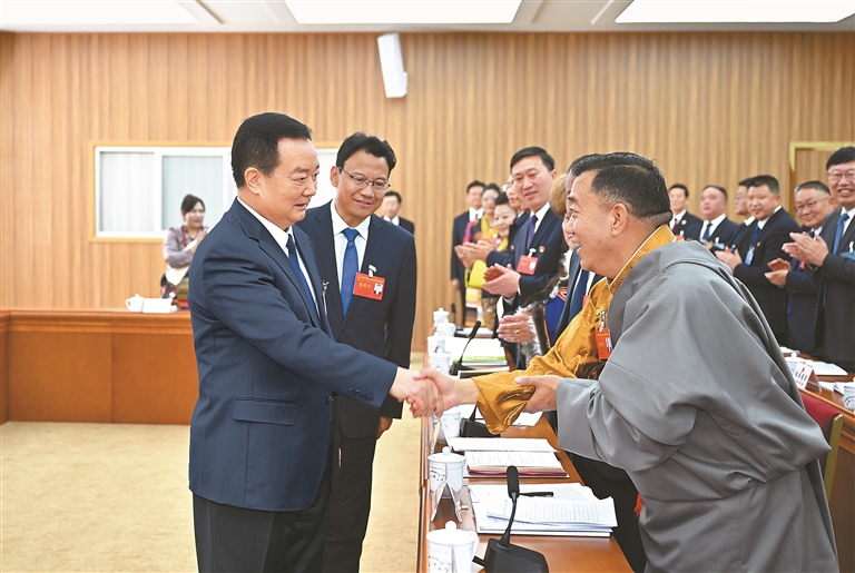 ཝང་ཅུན་ཀྲེང་གིས་ནན་བཤད་གནང་དོན། ཁྲིམས་བཞིན་བཅོས་སྐྱོང་མ་ལག་དང་བཅོས་སྐྱོང་ནུས་པ་དེང་རབས་ཅན་ལ་སྐུལ་འདེད་བཏང་ནས་ཡུན་རིང་བདེ་འཁོད་ཆེད་རྨང་གཞི་བརྟན་པོ་འདིང་དགོས། སྤྱི་ཡོངས་ཀྱི་རྒྱལ་ཁབ་བདེ་འཇགས་ལྟ་བ་བརྟན་པོ་འཛུགས་པ་དང་། ཁྲིམས་བཞིན་བོད་སྐྱོང་ལ་ཕྱོགས་ཡོངས་ནས་སྐུལ་འདེད་གཏོང་བ། བརྟན་ལྷིང་སྲུང་སྐྱོང་བྱ་རྒྱུ་དེ་ལས་འགན་ཨང་དང་པོར་བརྩི་བ་མཐའ་འཁྱོངས་བཅས་བྱས་ཏེ། འཐབ་ཇུས་ཐད་ངེས་ཤུགས་རྒྱུན་འཁྱོངས་དང་འཐབ་རྩལ་ཐད་ཇུས་འགོད་ཞིབ་ཚགས། ཐོན་ཁུངས་ཀྱི་སྟོབས་ཤུགས་བསྡུ་སྒྲིལ་བྱེད་ཤུགས་ཆེ་རུ་གཏོང་བ། འཕྲལ་སྡོམ་ཐག་གཅོད་ནུས་པ་ཆེ་རུ་གཏོང་བ། ཞབས་ཞུ་འགན་སྲུང་ཆུ་ཚད་མཐོ་རུ་གཏོང་བ། ལས་བྱེད་པའི་ཁྲིམས་སྐྱོང་བྱང་ཚད་དང་ཁྲིམས་བཞིན་ལས་དོན་སྒྲུབ་པའི་ཆུ་ཚད་མཐོ་རུ་གཏོང་བ། ཁྲིམས་འགལ་ཉེས་གསོག་གི་བྱེད་སྤྱོད་སྣ་ཚོགས་ལ་རྡུང་རྡེག་ནན་པོ་གཏོང་བ་བཅས་བྱས་ནས་མང་ཚོགས་ཀྱི་ཁྲིམས་མཐུན་ཁེ་དབང་ལ་ཁྲིམས་བཞིན་འགན་སྲུང་བྱེད་དགོས། ཀྲུང་ཧྭ་མི་རིགས་གཅིག་མཐུན་ཚོགས་པའི་འདུ་ཤེས་བརྟན་པོར་འཛུགས་པ་གཙོ་རྐང་དུ་བྱེད་པ་མཐའ་འཁྱོངས་ཀྱིས་ཀྲུང་ཧྭ་མི་རིགས་གཅིག་མཐུན་ཚོགས་པ་འཛུགས་སྐྱོང་ཏན་ཏིག་བྱེད་པ་དང་། ཆོས་ལུགས་ལས་དོན་བཅོས་སྐྱོང་ཁྲིམས་སྐྱོང་ཅན་དུ་འགྱུར་བར་ཤུགས་སྣོན་རྒྱག་པ། རྒྱུན་རྣམ་ཅན་གྱི་སྒོ་ནས“འདུ་ཤེས་གསུམ”གྱི་སློབ་གསོ་སྤེལ་བ། མི་རིགས་ཁག་གི་མང་ཚོགས་ལ“མོས་སེམས་ལྔ”ཟམ་མི་ཆད་པར་ཟབ་ཏུ་གཏོང་བར་ཁྲིད་སྟོན་བྱེད་པ། མི་རིགས་ཁག་གི་མང་ཚོགས་སེ་འབྲུའི་རྡོག་ལྟར་གོང་བུ་གཅིག་ཏུ་སྒྲིལ་བར་སྐུལ་འདེད་གཏོང་བ་བཅས་བྱས་ཏེ་མཉམ་དུ་མེས་རྒྱལ་མཐའ་མཚམས་སྲུང་སྐྱོང་དང་མཉམ་དུ་མཛེས་སྡུག་ལྡན་པའི་འཚོ་བ་གཏོད་དགོས།